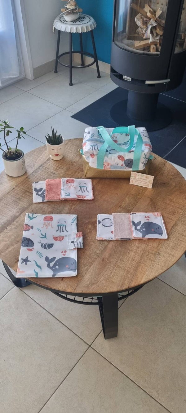 Tot bag, trousse avec sangle, protège carnet , lingettes en bambous x6.